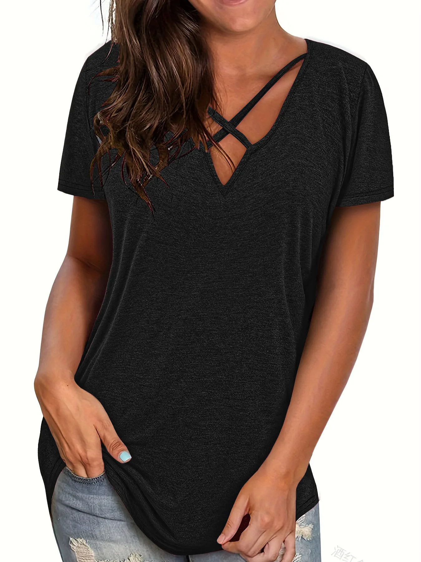 2024 AliExpress Europe and the United States Summer Fashion Plus Size Front Chest Cross V Neck Solid Color Short Sleeve T-Shirt