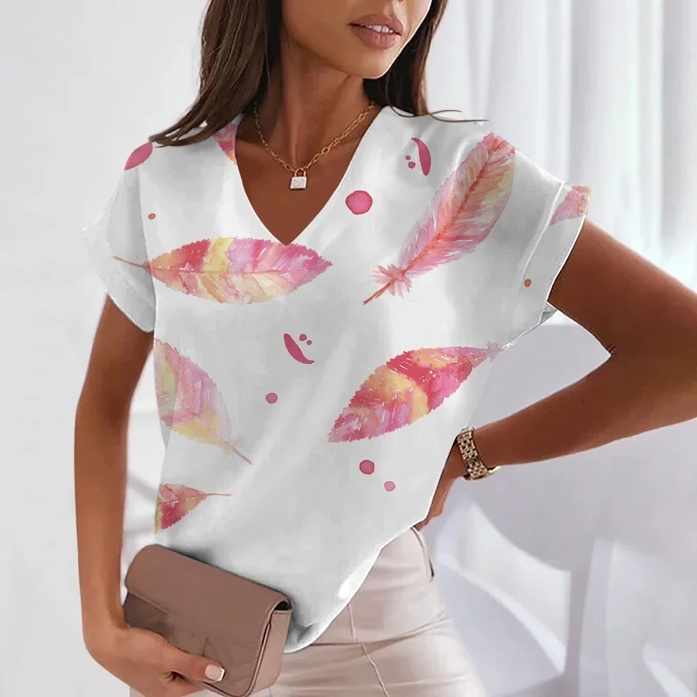 Summer Short Sleeve T-Shirt Feather Pattern 3D Women's Tops V Neck Women's Plus Size Women's Fashion y2k Street Trend Clothing